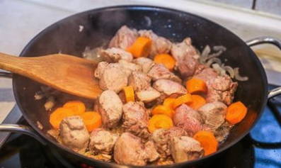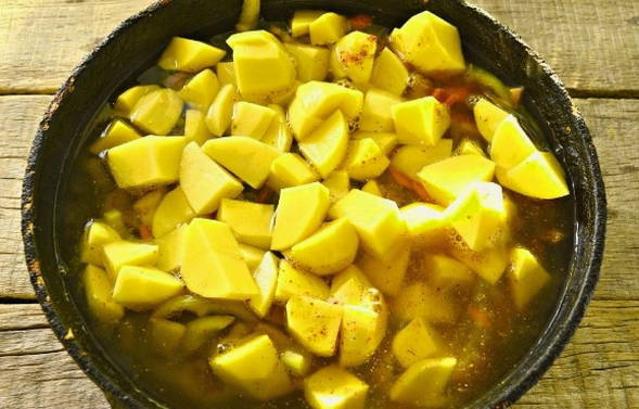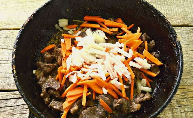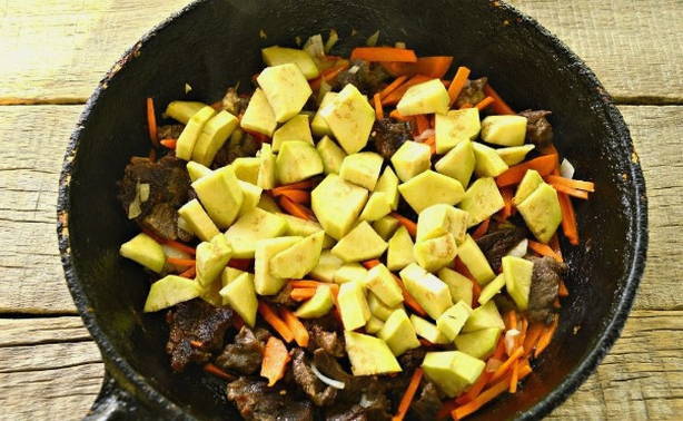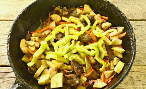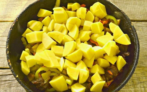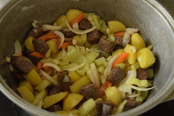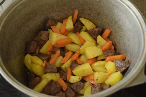 - Op dit moment verwarmen we de ketel met olie. Bak hierin vlees, aardappelen en wortelen. Kook op middelhoog vuur ongeveer 20 minuten.