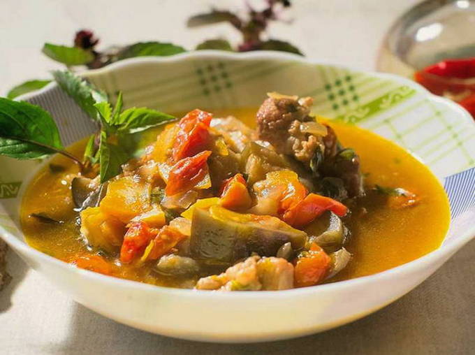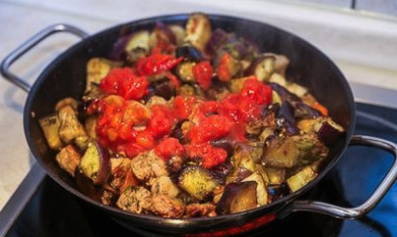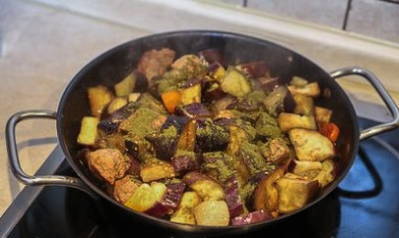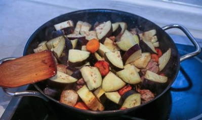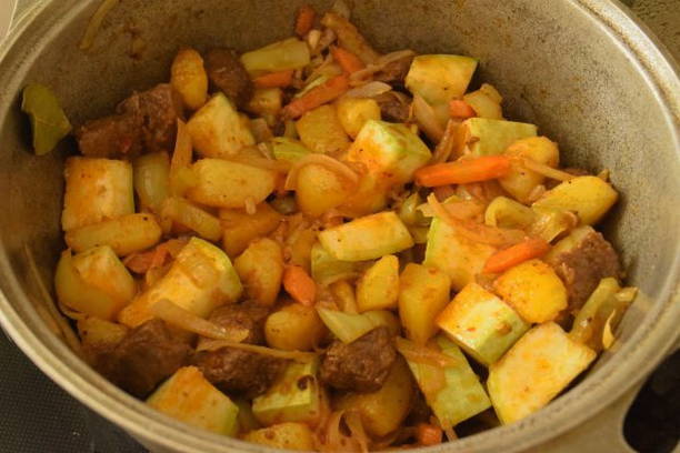 - Stoofpotje met aubergine, vlees, courgette en aardappelen