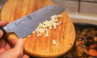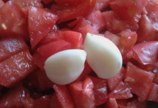- Snijd de tomaten in blokjes, pel de knoflook en hak deze fijn.