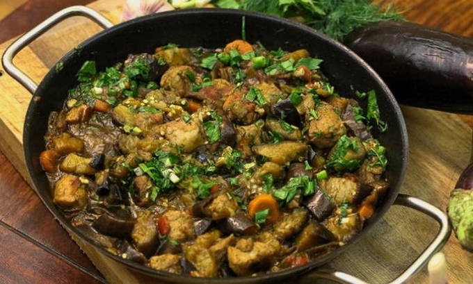 - Sappige aubergines met vlees en aardappelen, gestoofd in een ketel
