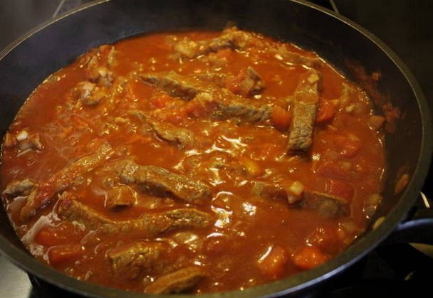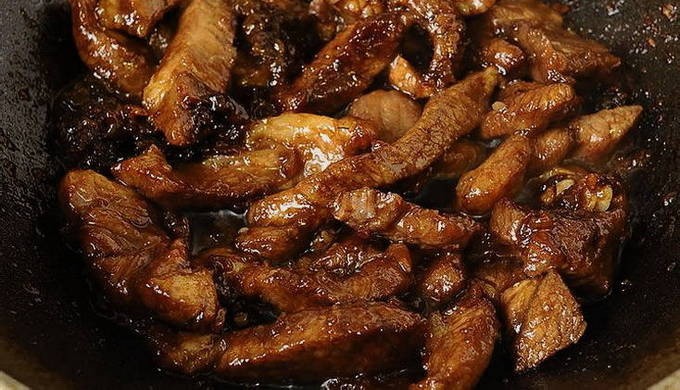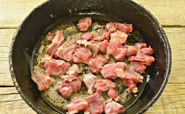 - Verdeel het vlees in kleine stukjes, die we vervolgens in plantaardige olie bakken tot een heldere blos.