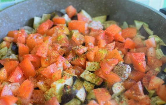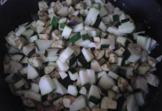 - De inhoud vullen we aan met aubergines, die we vooraf in blokjes snijden. We zullen nog 10-15 minuten wegkwijnen.