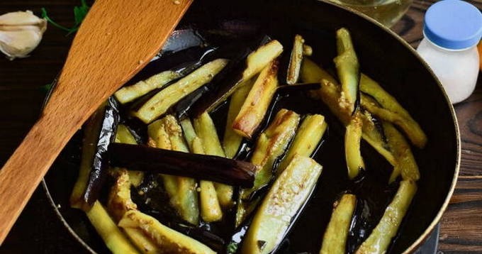 - Snijd de aubergine in reepjes, bak deze in zetmeel en een beetje sojasaus.