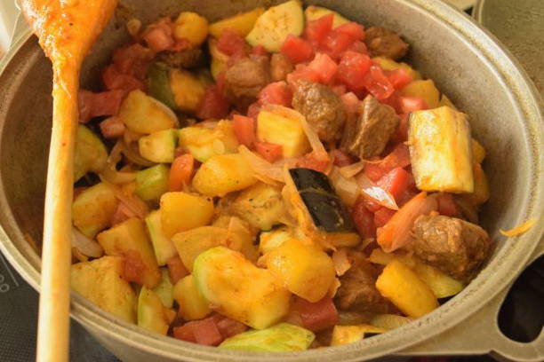 Stoofpotje met aubergine, vlees, courgette en aardappelen