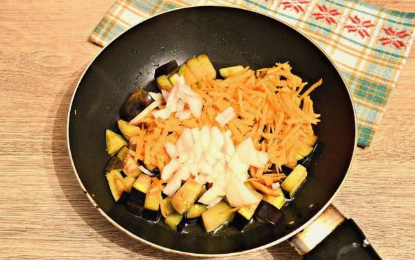 - We brengen de voorbereide groenten over naar een gemeenschappelijke koekenpan. Zout het gerecht, roer en laat 10 minuten op laag vuur staan.