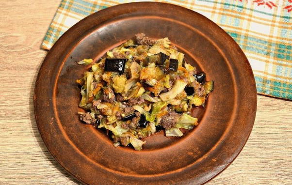 Stapsgewijs recept voor het koken van aubergine met vlees en kool