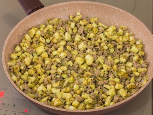 - Voeg vervolgens het gehakt toe aan de ui. Roer en bak nog 5-10 minuten.