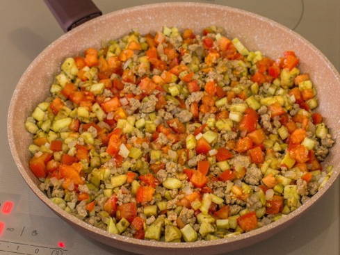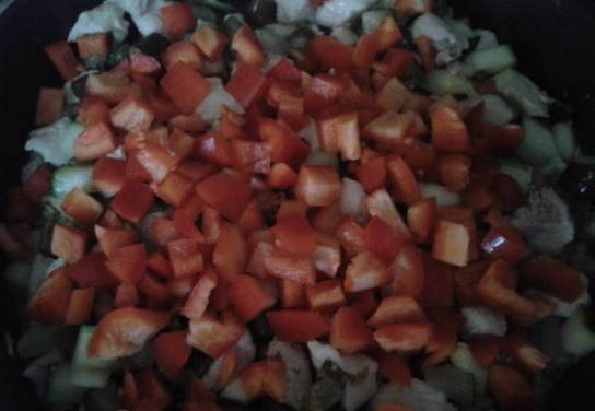 - Voeg na 5-7 minuten de inhoud van de paprika toe.