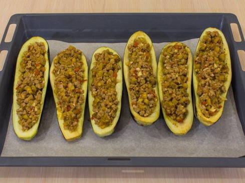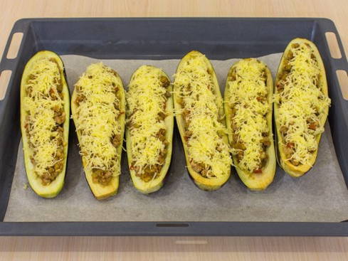- Vul de auberginehelften met vulling met gehakt. Leg het product op een bakplaat met bakpapier.