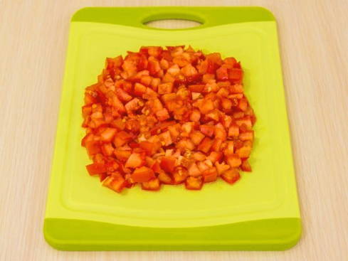 - Voeg 5 minuten voor het koken gehakte tomaten toe aan de massa.