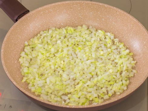 - Snijd de uien dun. Bak de groente in een pan tot ze zacht zijn.