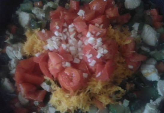 - Voeg vervolgens de ui en dunne stukjes paprika toe. Kneed en laat nog 7 minuten sudderen.