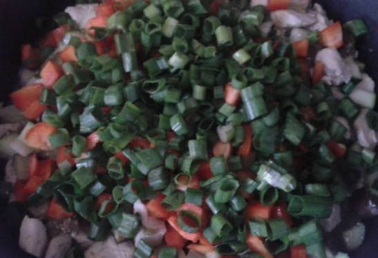 - Doe hier gehakte groene uien. Laat de inhoud op middelhoog vuur sudderen.