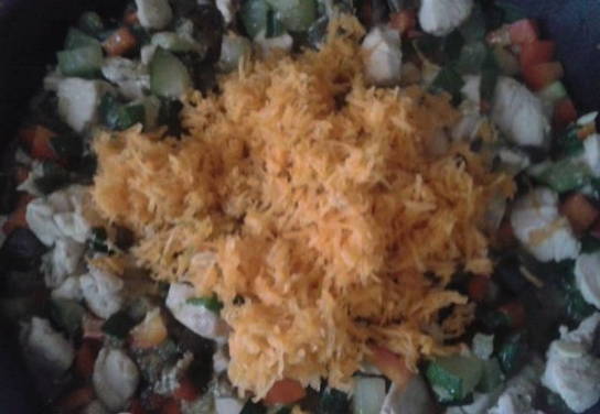 - Voeg vervolgens gesnipperde uien en geraspte wortelen toe.