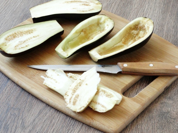 We wassen de aubergines, verwijderen de stelen en snijden ze doormidden. Je kunt de schil aan de onderkant van de auberginehelften een beetje afsnijden om de bootjes stabieler te maken, verwijder het vruchtvlees. Zout en laat de aubergines 15-20 minuten staan om de bitterheid te verwijderen.