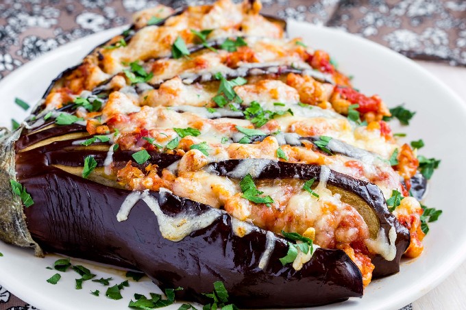 Auberginebootjes met tomaten en kaas