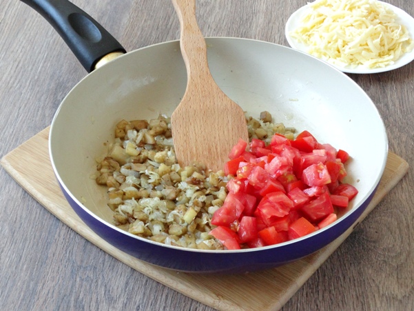 - Fruit de ui op laag vuur in een koekenpan, voeg er fijngehakte tomaten aan toe, zout de rest van de aubergine, peper, knoflook, breng op smaak met kruiden, laat vijf minuten sudderen en haal van het vuur.