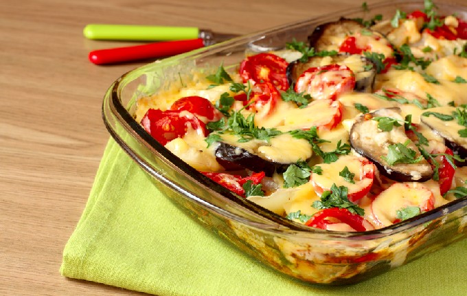 Aubergine gebakken met aardappelen, tomaat, kaas in de oven