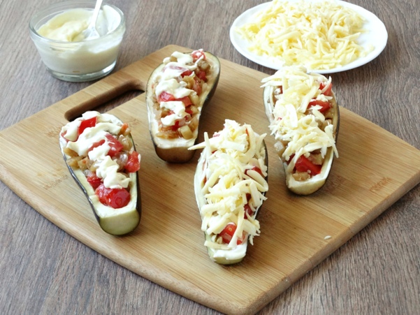 Vet elke aubergineboot in met een mengsel van mayonaise en knoflook. Vul de bootjes met vulling en bestrooi met kaas.