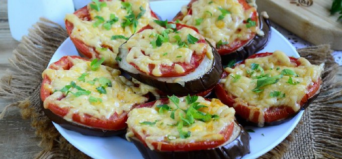 In deze combinatie kunnen gebakken aubergines en tomaten met kaas als sandwiches worden geserveerd, ze zijn zowel warm als koud goed.