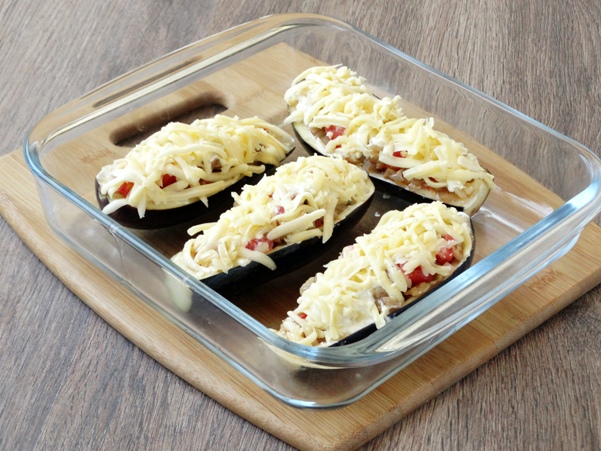 - Vul de auberginehelften met het groentemengsel en bestrooi met geraspte kaas.