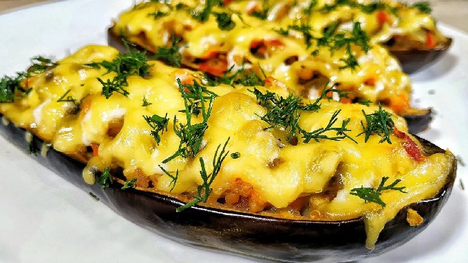 - We halen de auberginehelften uit het water, geven een paar minuten de tijd om het overtollige water te laten glazuren. Vul ze met vulling, bestrooi ze met geraspte kaas. We verspreiden de aubergines op een bakplaat en sturen ze 30 minuten naar de oven, stellen de temperatuur in op 220 graden.