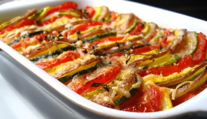 - We zetten het gerecht met groenten in de oven, stellen de temperatuur in op 220-250 graden en bakken 20-25 minuten.