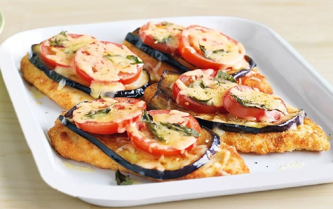 - Verzamel het voorgerecht op een ingevette bakplaat: leg eerst de aubergineplakken, bedek ze met mayonaisesaus, leg de tomaten erop en bestrooi met een snufje zout, eindig met een snufje kaas.