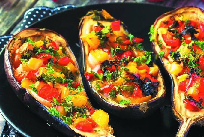 - Leg de gevulde aubergines op een bakplaat, eerder verzonden met bakpapier en ingevet met plantaardige olie.