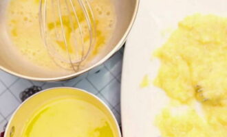 - Meng in een kom de suiker en het ei. Voeg plantaardige olie toe, klop opnieuw.