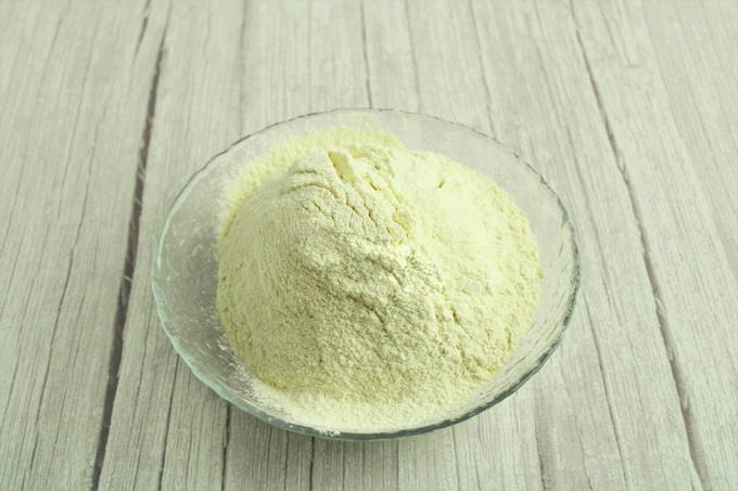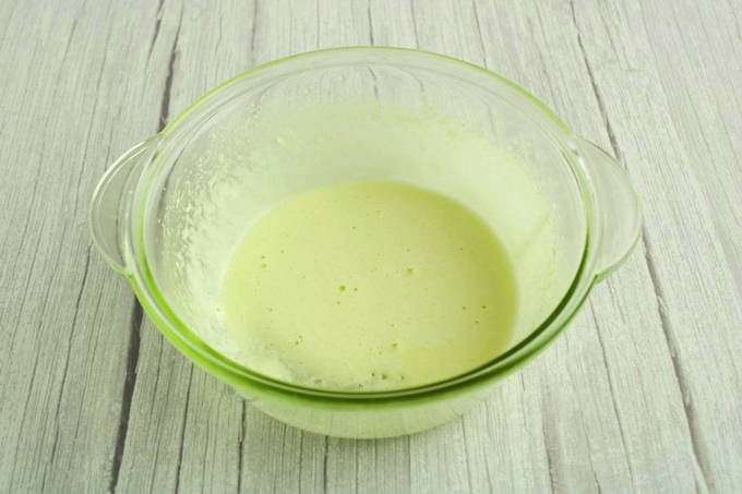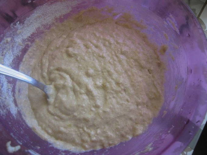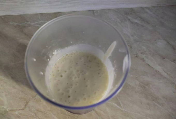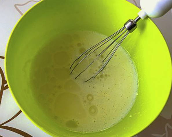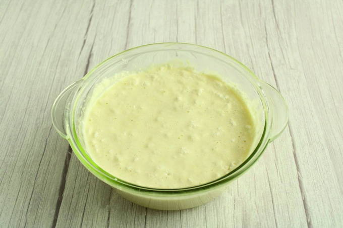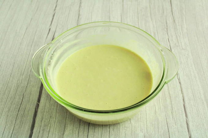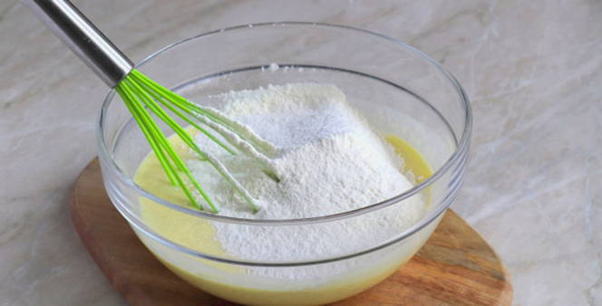 - Giet melk en plantaardige olie erbij, voeg rijstmeel en bakpoeder toe. Meng ingrediënten tot een gladde massa.