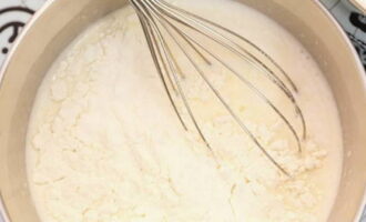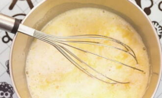 - Klop de dooiers samen met de suiker tot een lichte massa.Voeg dan warme melk toe en roer.