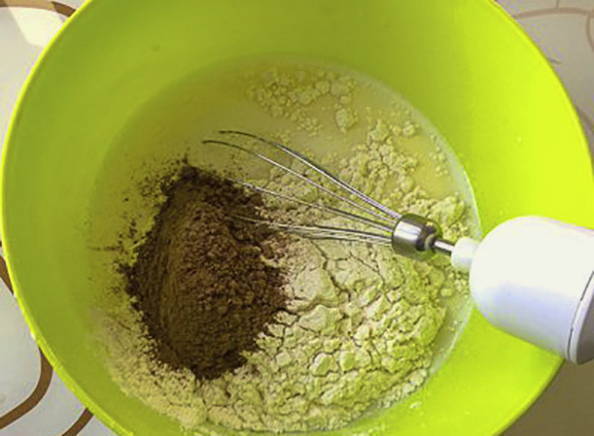 - Bloem en cacao door een fijne zeef zeven, mengen met bakpoeder voor deeg. Voeg droge ingrediënten toe aan een kom.