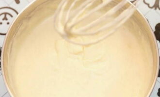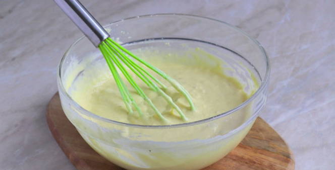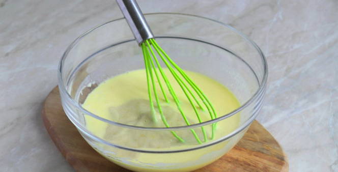 - Voeg de resulterende massa toe aan het deeg en meng met langzame bewegingen, hierdoor worden de pannenkoeken luchtig.