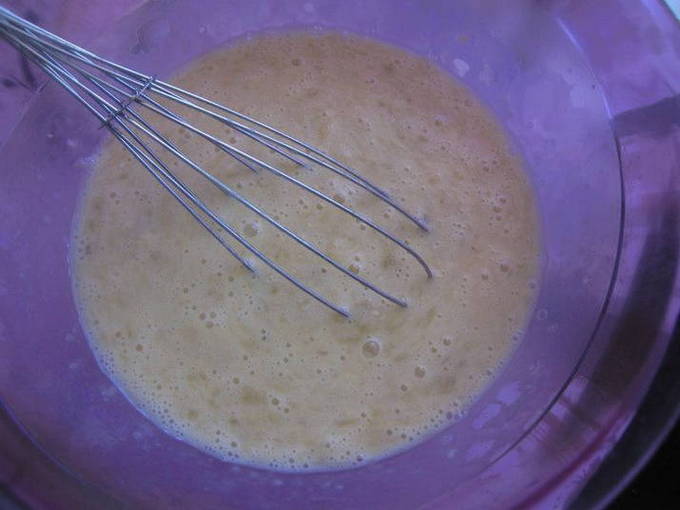 - Voeg bananen toe aan de ei- en melkmassa, roer.