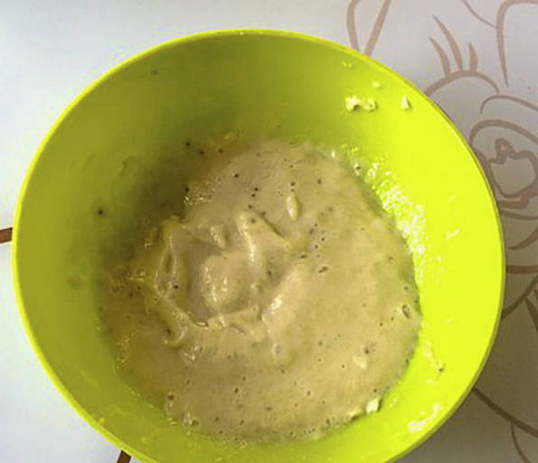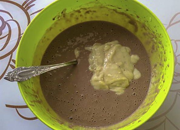 Combineer losgeklopte eieren, gesmolten boter en geprakte banaan.