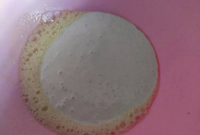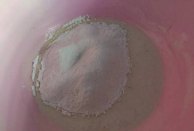 - Giet kefir in een kom, voeg bakpoeder voor deeg toe, meng en laat 5-10 minuten staan.