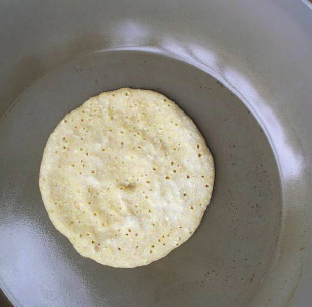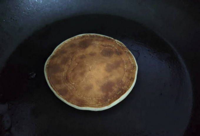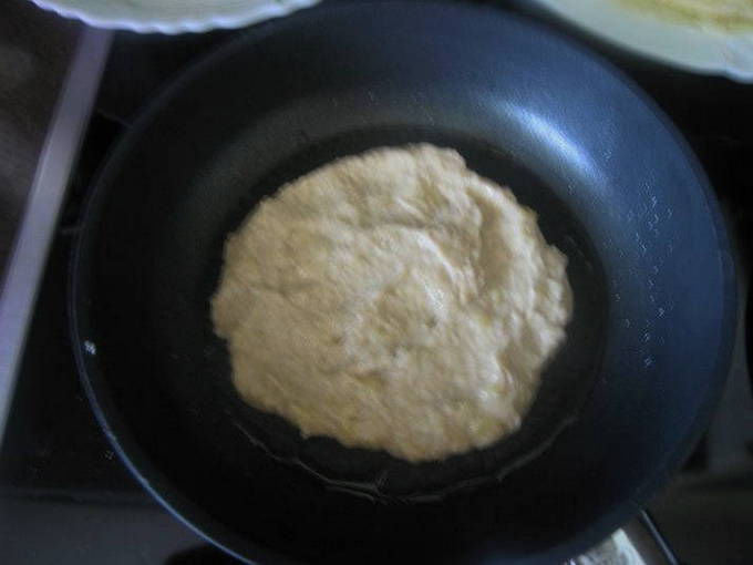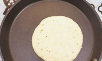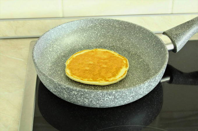 Leg het deeg in een goed verwarmde droge koekenpan. Wanneer er belletjes op het oppervlak verschijnen, kan de pannenkoek worden omgedraaid.
