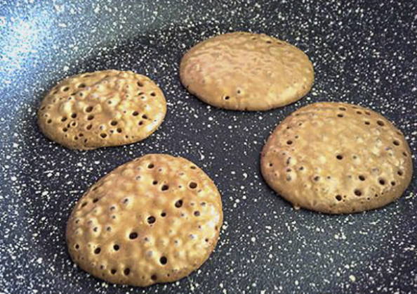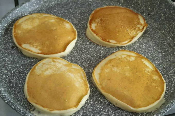 - Wanneer er belletjes op het oppervlak van de pannenkoeken verschijnen, draai de pannenkoeken dan om en bak ze aan de andere kant.