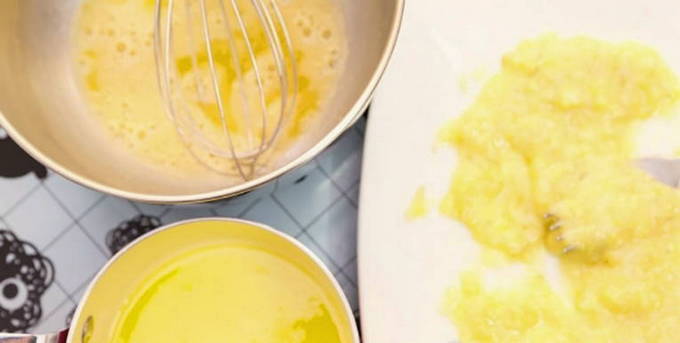 - Meng in een kom de suiker en het ei. Voeg plantaardige olie toe, klop opnieuw.