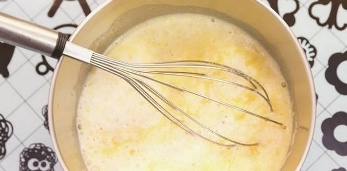 - Klop de dooiers samen met de suiker tot een lichte massa.Voeg dan warme melk toe en roer.