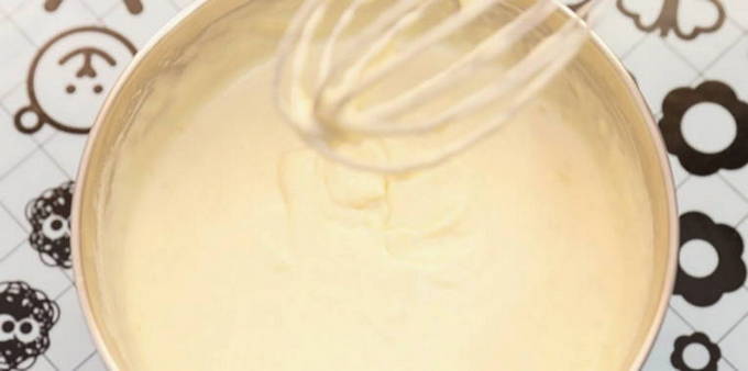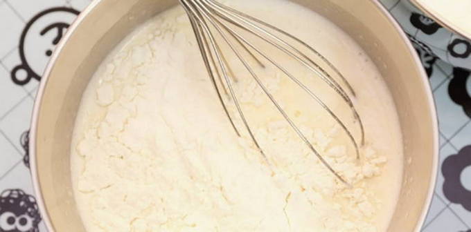 - Giet melk en plantaardige olie erbij, voeg rijstmeel en bakpoeder toe. Meng ingrediënten tot een gladde massa.