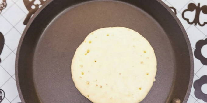 Leg het deeg in een goed verwarmde droge koekenpan. Wanneer er belletjes op het oppervlak verschijnen, kan de pannenkoek worden omgedraaid.