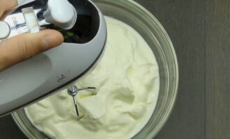 - Combineer vette zure room met suiker en klop met een mixer licht luchtig. Het is wenselijk totdat de suikerkorrels volledig zijn opgelost.