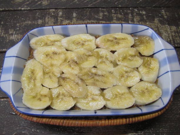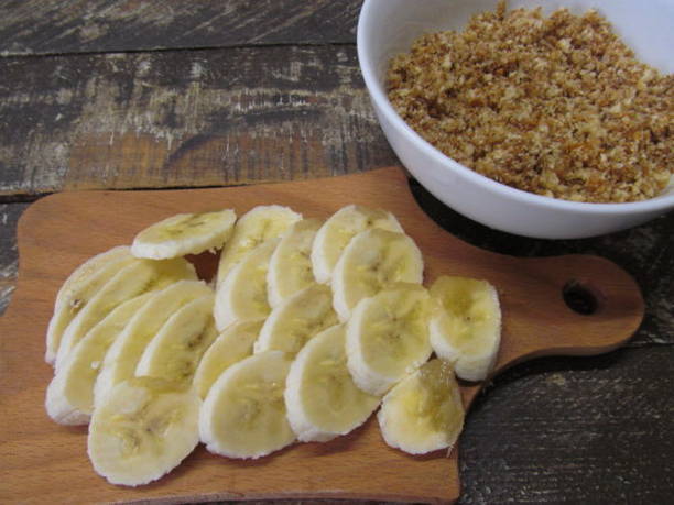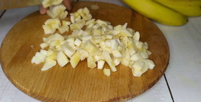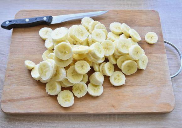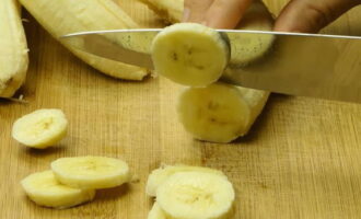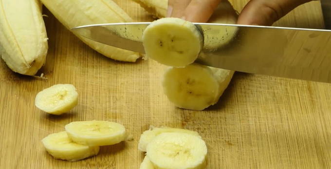 - Snijd tegelijkertijd de bananen in dunne plakjes tot een dikte van ongeveer 0,5 centimeter.