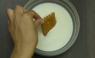 Dompel de koekjes één voor één in een aparte kom melk en verdeel ze in een laag bijna één op één op een aparte schaal.