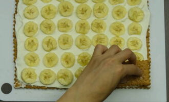 - Leg de gehakte bananen op een laag room. We voeren dezelfde manipulaties uit met de tweede en derde cake.