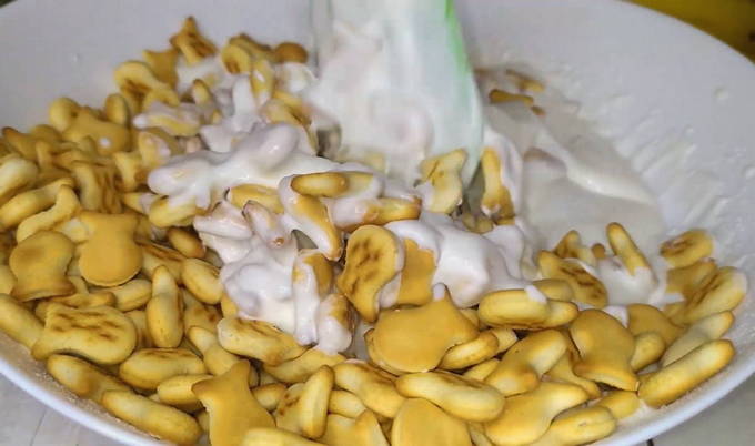 - Voeg gehakte banaan, "Rybka" cracker toe aan de zure room en meng goed zodat zowel de bananen als de cracker volledig in de zure room zitten.