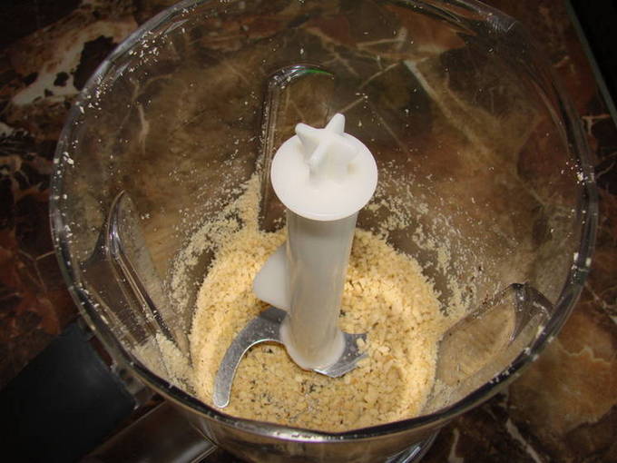 - Doe de noten in een blenderkom en maal tot middelgrote korrels. Je kunt een mes of vijzel gebruiken.
