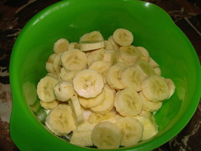 - Snijd de bananen gelijkmatig in kleine plakjes. Het is beter om bananen onrijp te nemen, omdat ze langzamer zwart worden.